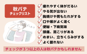 秋バテとは、夏の暑さや冷房による自律神経の乱れが原因で、